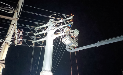 特種作業(yè)登高車到達故障現(xiàn)場,工作人員在檢查所需用品、現(xiàn)場照明等條件就緒后,立即穿戴好絕緣靴、絕緣手套進行線路停電工作。停電后,桿上作業(yè)人員使用緊線器將故障點兩端導(dǎo)線收緊對損壞的絕緣子進行更換。由于所更換絕緣子位于桿塔頂部兩側(cè),工作負責人時刻緊盯高空作業(yè)人員動態(tài),指揮作業(yè)車調(diào)整位置及補充照明。在更換第二項絕緣子時工作人員發(fā)現(xiàn)因?qū)Ь€缺少松弛余量,無法更換元件,經(jīng)過技術(shù)商議后,工作人員通過尼龍繩將準備好的材料從地面拉到登高車上,并用溝線夾延長導(dǎo)線的方法更換了全部損壞絕緣子。經(jīng)過3個小時的緊張搶修,故障線路恢復(fù)供電。